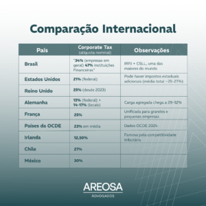 2. Efeito cascata e precedentes internacionais: O problema se agrava porque, em países desenvolvidos, onde há tributação de dividendos, em geral a carga sobre a empresa é menor que no Brasil (vide tabela). No Brasil, esse gap reduz a competitividade, tornando o ambiente menos atrativo para multinacionais e investidores estrangeiros, e gerando potencial fuga de capitais produtivos.